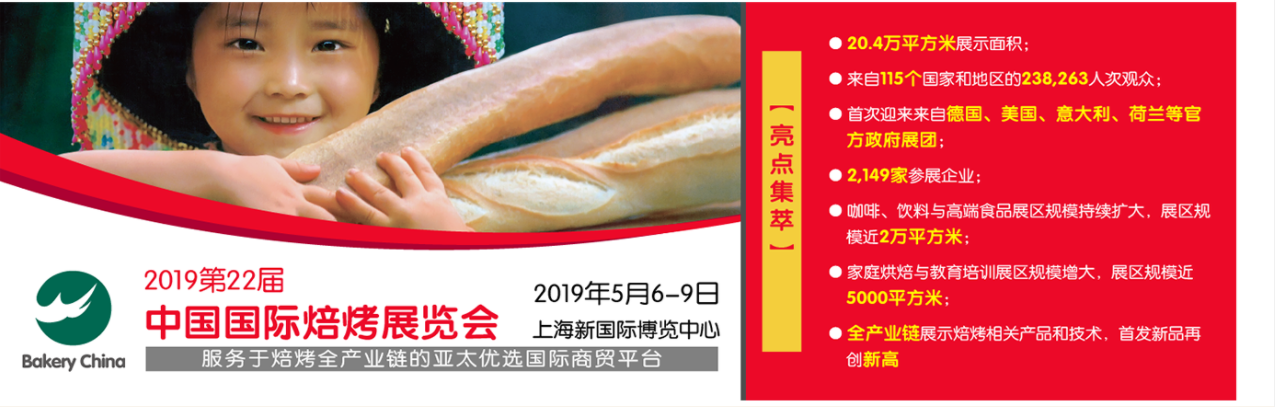 2018年第21屆中國國際焙烤展覽會已于5月9-12日舉行,展會場地達20.4萬平方米,以滿足需求不斷增長的中國烘焙市場。展會吸引了來自近30個國家和地區(qū)的2,149家參展企業(yè)與來自115個國家和地區(qū)的238,263人次參觀,并首次與各國家政府合作組織來自德國、美國、意大利、荷蘭的官方國家政府展團。為行業(yè)提供了高質量與高性價比的烘焙原料、設備及相關產品與服務的商貿平臺,搭建行業(yè)最新產品和技術的學習和交流的商務平臺。Bakery China 2019 將于5月6-9日繼續(xù)與您相約上海新國際博覽中心。
